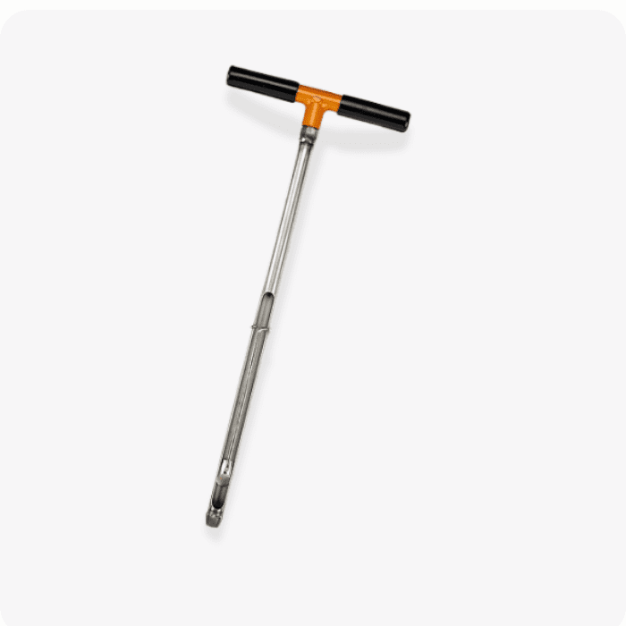 • Diseño Monopiezas con Mango en «T»: La sonda incorpora un mango transversal soldado sólidamente al cuerpo tubular principal. Esta arquitectura de una sola pieza maximiza la transferencia de fuerza desde el operador hacia la punta de corte, soportando la presión y el torque necesarios para penetrar suelos compactos.